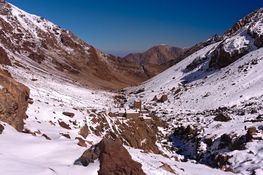 Leave the bustling city behind and drive 1.5 hours to Imlil village, the gateway to the Toubkal Massif. Meet your local guide and mule team, then begin your trek through the Ait Mizane Valley, passing the village of Armed and the holy shrine of Sidi Chamharouch. After a lunch break, follow a mule trail up to Toubkal Refuge (3207m). Spend the night in dormitory-style accommodation or camp outside. Hiking: ~6 hours